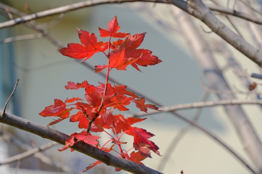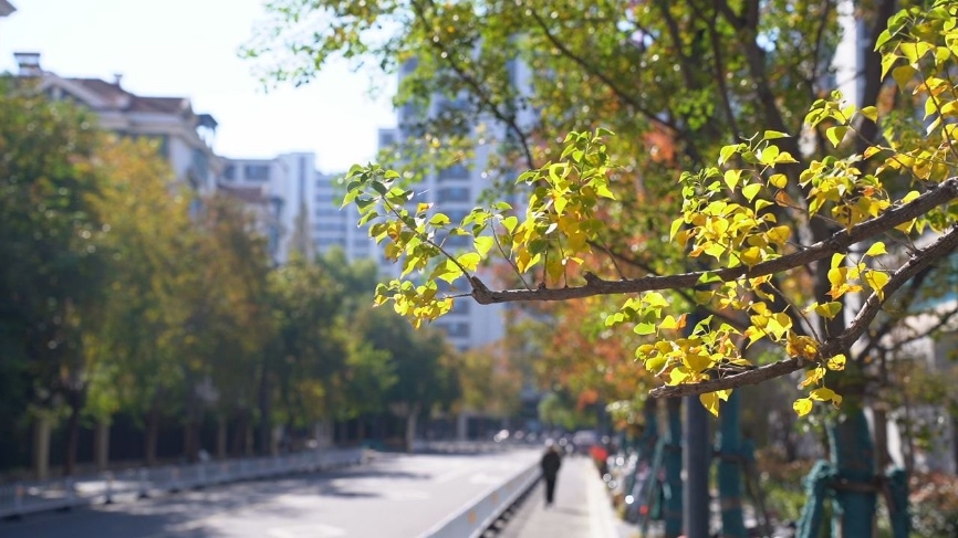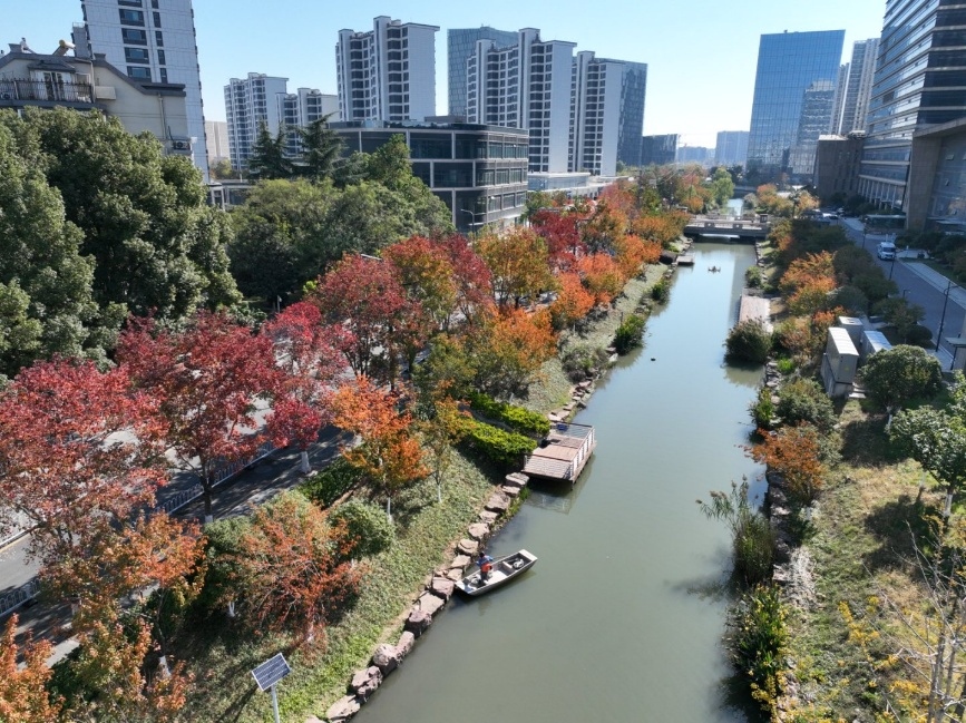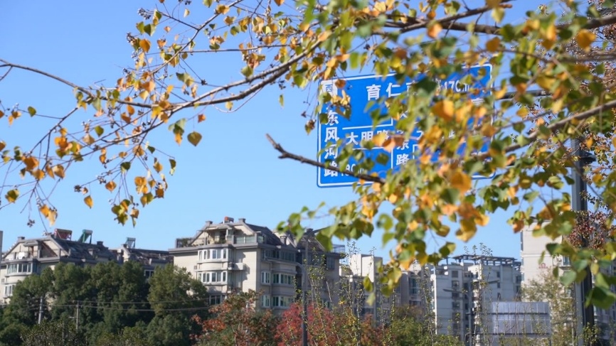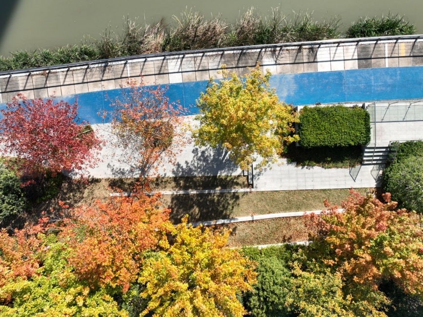 枫树的赤红、银杏的金黄、乌桕的斑斓妆点堤岸