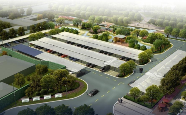停车场展示区是智慧停车结合实用性的探索,设计上力求适应整体环境,合理布置道路环线,最大量的布置停车位。停车位铺贴材料外沿为米黄色烧结砖、内部为井字型植草砖,进行嵌草处理。下设排水孔,积水可通过排水孔流入地下雨水管网。还设有电动汽车充电桩,体现新能源概念。