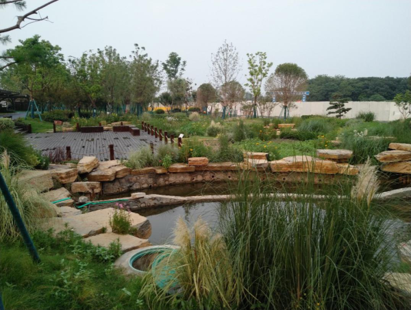 雨水花园是海绵应用的一种形式,采用一级沉淀、四级跌水设计,主要收集道路、特色街巷雨水依次进入雨水花园的前置塘、潜流湿地、沼泽区、到达观景水池,经层层净化的雨水可进行循环利用和排放。