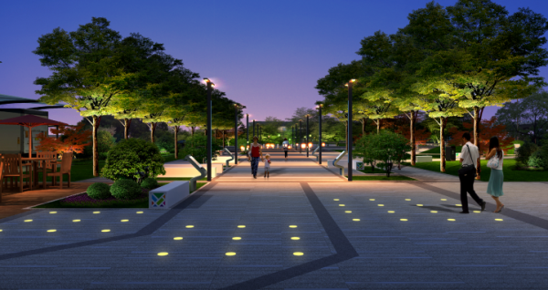 特色街巷展示区根据上位规划“街巷纵横、绿道延展,密集路网小区”的特色模式设计,将特色街巷展示区设计为独特的绿色交通体系,并结合特色街巷设置各类城市级、社区级公共服务设施。特色街巷主要展示大面积透水铺装及特色街巷风貌展示,以灰色透水砖及透水混凝土为基调,搭配防腐木、花岗岩等分割跳色。基层设计为透水混凝土,利于雨水下渗。布有特色树池,多样式坐凳等。
