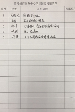 南部新城临时招商服务中心项目于2016年12月31日进驻办公,为了解各单位使用情况和搜集意见,近期,智慧新城公司组织施工单位对管委会各处室和集团公司进行回访。检查办公楼可能存在的损耗、损坏等工程隐患,针对反馈情况,已组织施工单位进行维修。同时,监理单位也将跟踪、复查后续推进情况,确保工程质量。智慧公司将与健康产业公司加强协作,将办公区域服务标准不断优化升级!