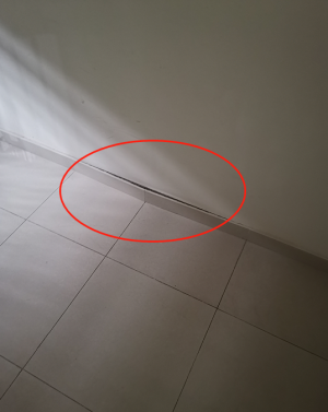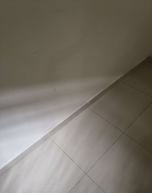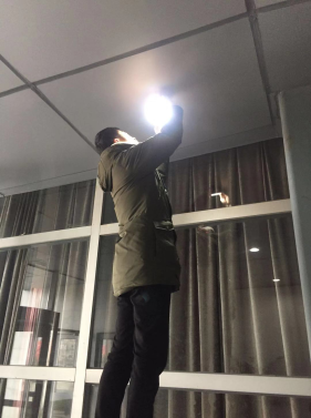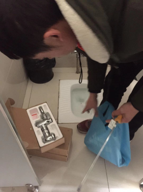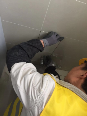 工人进行1号楼男卫墙砖补贴 男卫更换脚踩阀 门厅筒灯复位