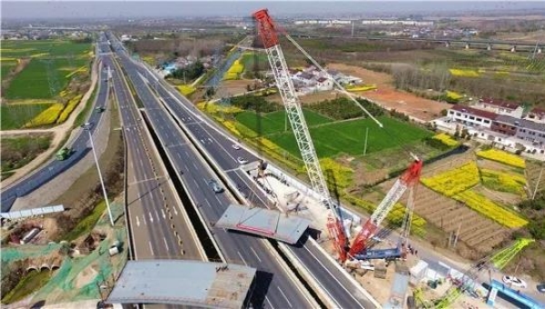 在党中央及省市“一手抓防疫、一手抓复产”的号召下,南部新城管委会统筹安排,积极推进,潘家花园立交二期工程率先实现复工,全面掀起大干快上的复工高潮,春节后依次完成了南北两侧边跨吊装,此次吊装的E4联中跨合龙段钢梁长23.5m,重148吨,采用500T的履带起重机进行吊装。