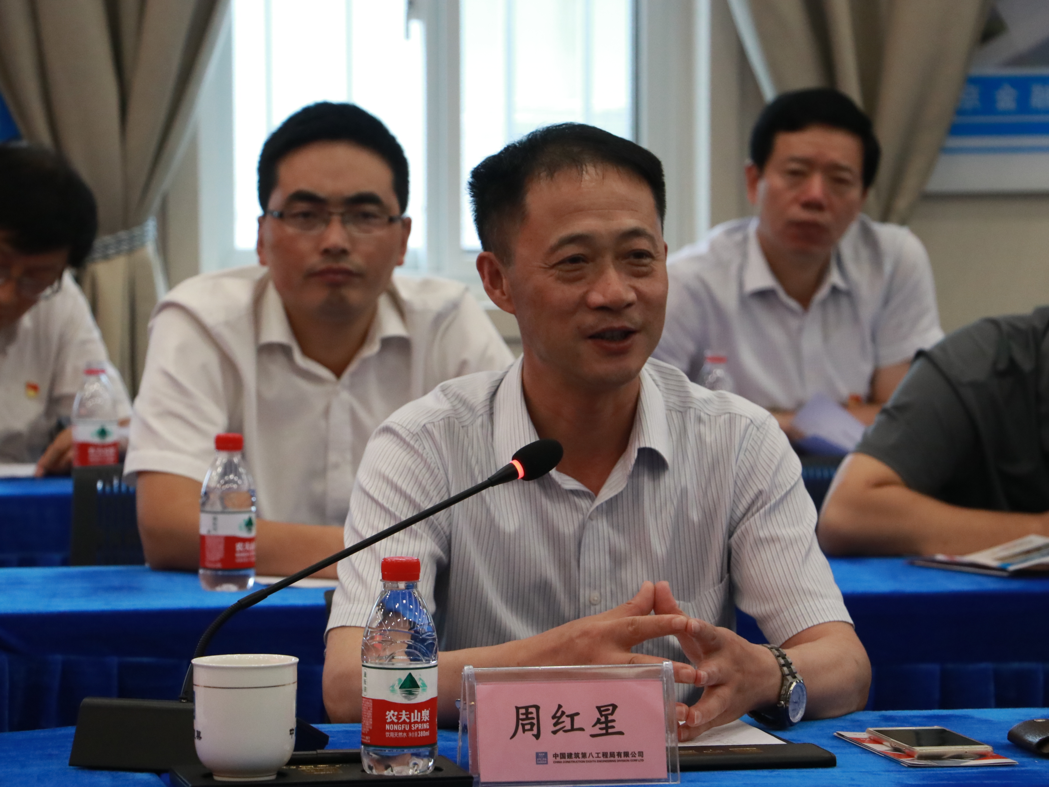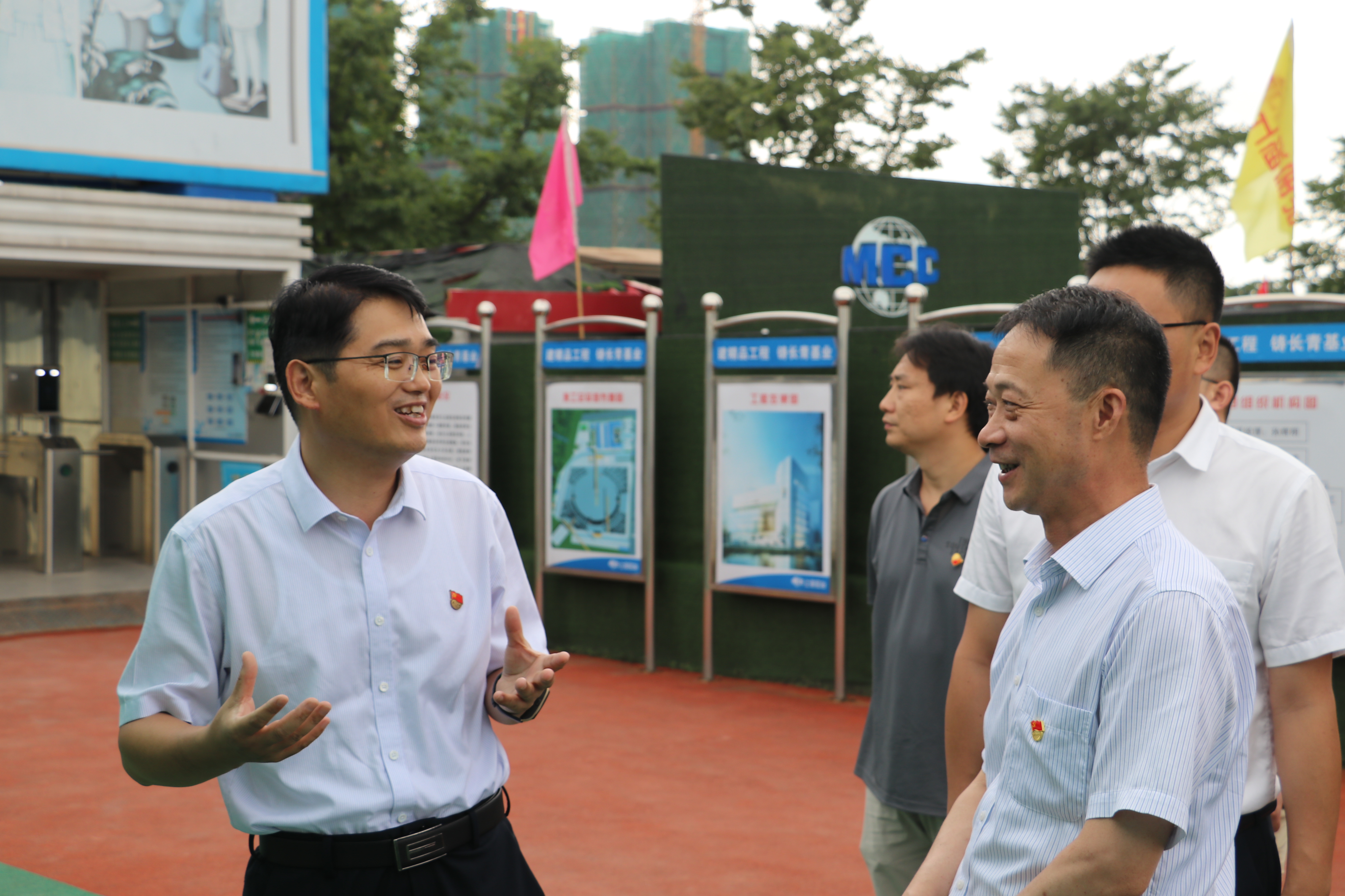 周红星一行调研了江北新区图书馆项目党员驿站、扬子江会议中心党员驿站项目,并随后与中建八局三公司进行交流座谈。江北新区公建中心办公室副主任陈永培、中建八局三公司党委书记业绪敏从支部建设按规范、支部党员争先锋、党建联建促发展、工团建设凝人心、纪检监督做保障几个方面详细介绍了中建八局“党建+项目”的工作经验和工作方法。