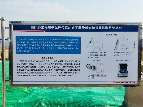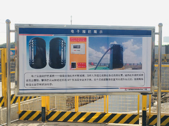 中片区国际路观摩现场安全分区管理借助各类高科技设备,使现场管理更加迅速、精确、高效,如自动喷淋系统联动扬尘监测设备,当空气中PM10超过设定值后自动开启喷淋。基坑内使用光纤光栅传感器,通过不断扫描基坑护壁及地面曲线与计算值对比,警示和警报出现风险区域,提高施工风险感知。现场基坑边还设置电子围栏,一旦有人闯入将立即警告并告知附近安全员。
