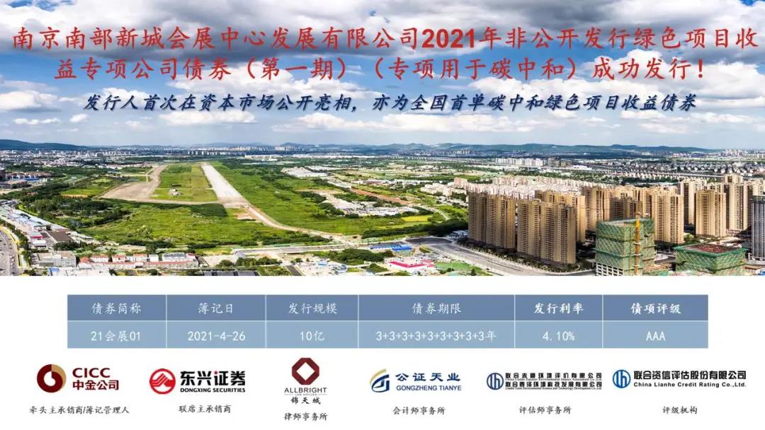 2021年4月26日,“南京南部新城会展中心发展有限公司2021年非公开发行绿色项目收益专项公司债券(第一期)(专项用于碳中和)”成功发行。