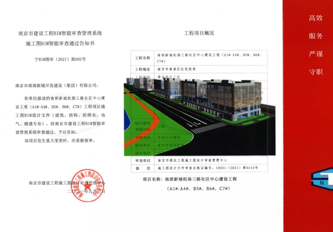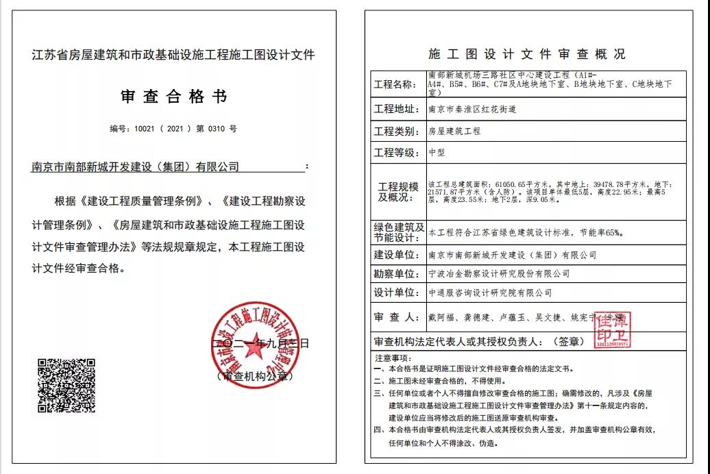 2021年9月3日,南部新城机场三路社区中心建设工程顺利通过南京市建设工程施工图设计审查管理中心施工图审查,同步取得了“施工图设计文件审查合格书”。该项目由中通服咨询设计研究院有限公司设计,是南部新城首个同时通过BIM规划报建和BIM施工图报审的项目,也同步入选为南京市首批BIM示范项目。